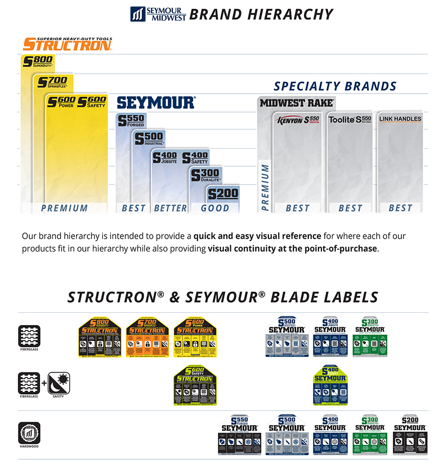 Numerical Hierarchy: Our brand hierarchy chart is your “decoder ring” for the brands that call Seymour Midwest home. Our numerical hierarchy features a Good / Better / Best / Premium line-up. There’s nothing one-size-fits-all about our tools, and making sure there is clear product differentiation as you move up and down the hierarchy means easier, more informed selling and purchasing. |