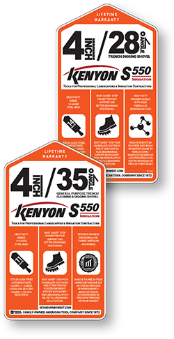 Polymer, fiberglass, hardwood – 28° and 35° angle options…that adds up to a lot of trenching shovel options, 24 to be exact and we wouldn’t have it any other way. Everyone has their preference when it comes to trenching shovels and we’re here to make sure you have the exact option you, your crew and the job require. The same logic and completeness of product line is the hallmark of the Kenyon S550 Irrigation™ offering. Kenyon is the home of specialized irrigation and landscaping tools.
